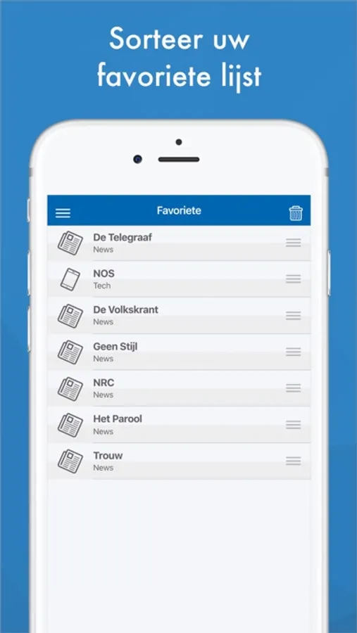 Some of the newspapers you can find are: AT5, Algemeen Dagblad, Almere Vandaag, Autovisie, AutoWeek, BN/De Stem, Brabants Dagblad, Dagblad De Limburger, Dagblad van het Noorden, De Gelderlander, De Stentor, De Telegraaf, De Volkskrant, Digitaal, DutchNews.nl, Eindhovens Dagblad, Elsevier, FOK!, Google Nieuws, Geen Stijl, Gooi-en Eemlander, Haarlems Dagblad, Het Financieele Dagblad, Het Parool, IJmuider Courant, L1, Leeuwarder Courant, Leidsch Dagblad, Meppeler Courant, Metro, Nederlands Dagblad, Noordhollands Dagblad, NOS, NRC Handelsblad, NRC.Next, NU, Nusport, Omroep Brabant, Omroep Flevoland, Omroep Gelderland, PZC, Reformatorisch Dagblad, RTL Nieuws, RTV Noord-Holland, RTV Utrecht, Sp!ts, Trouw, Tweakers, Tubantia, TVGids, Voetbal International...