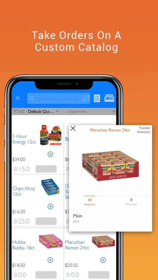 Increase upsell and cross-selling opportunities with the convenience of a digital product catalog with high resolution product images, inventory, pricing, UOM, minimum & case quantity data. Create custom price lists, transfer inventory between warehouses, and generate a PDF catalog for download. Works well at trade shows, warehouses, retail stores - wherever you need to make a sale!