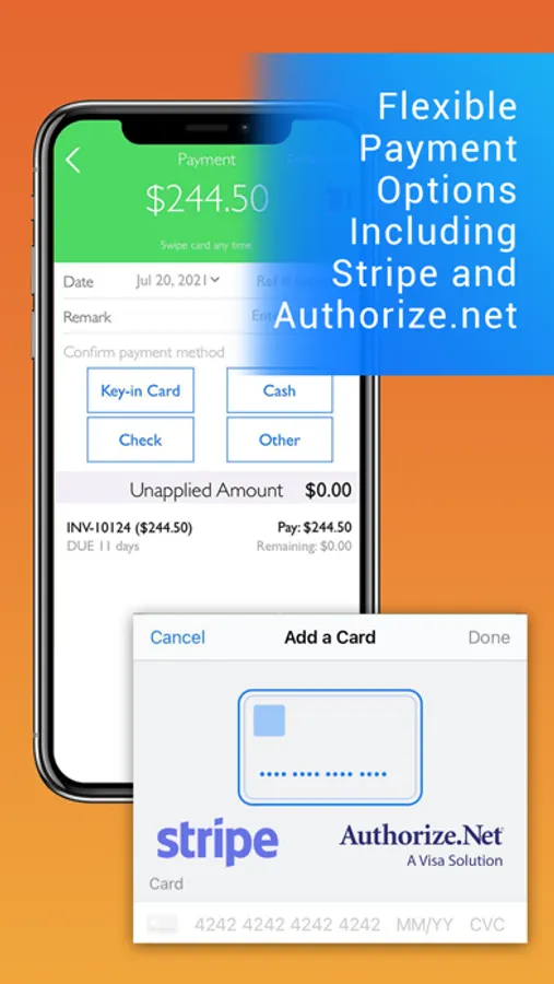 Credit and debit card payments can be securely recorded with the app. Our mobile payment system enables acceptance with manual entry, a card reader, barcode scanner or a bluetooth scanner.
