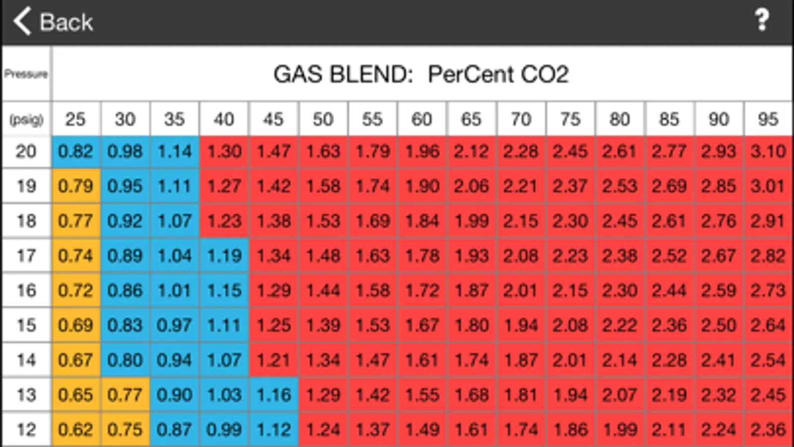 The Acceptable Ranges screen will show you (highlighted in blue) the combinations of Blend and Pressure that will keep your beverage properly carbonated. A +/- 0.2% range of CO2 volumes is the accepted industry allowance for this variation. These results are based on valves you enter into the “input” screen and will change as you modify input values.