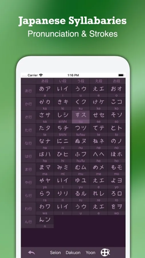 + Japanese Syllabaries: Includes Seion, Dakuon, Handakuon and Yoon letters, etc, touch a letter to read it.