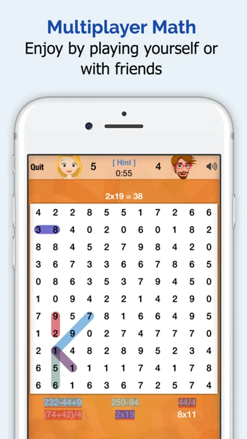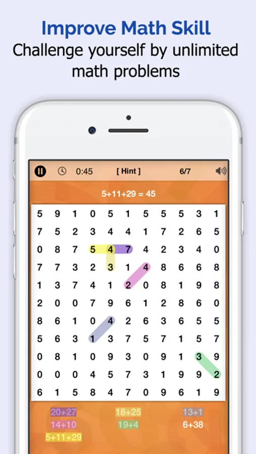 The game then displays seven math problems and a grid of numbers. You must solve the math problem in your head and then drag your fingers across the correct numbers in the grid, similar to a word search game.