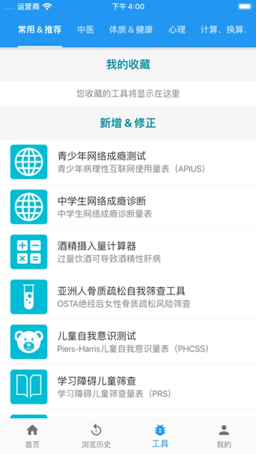 12.女性安全期计算器、预产期计算器、五行八字计算、孕期体重增长正常值计算、体温水平评价、成人血压评价、糖尿病饮食建议、人体体表面积计算、BMI指数计算及评价、临床生化常用单位换算、基础代谢率计算、补钠计算器、补铁计算器、有效血浆渗透压计算器、乙醇摄入量计算器等医学计算工具
