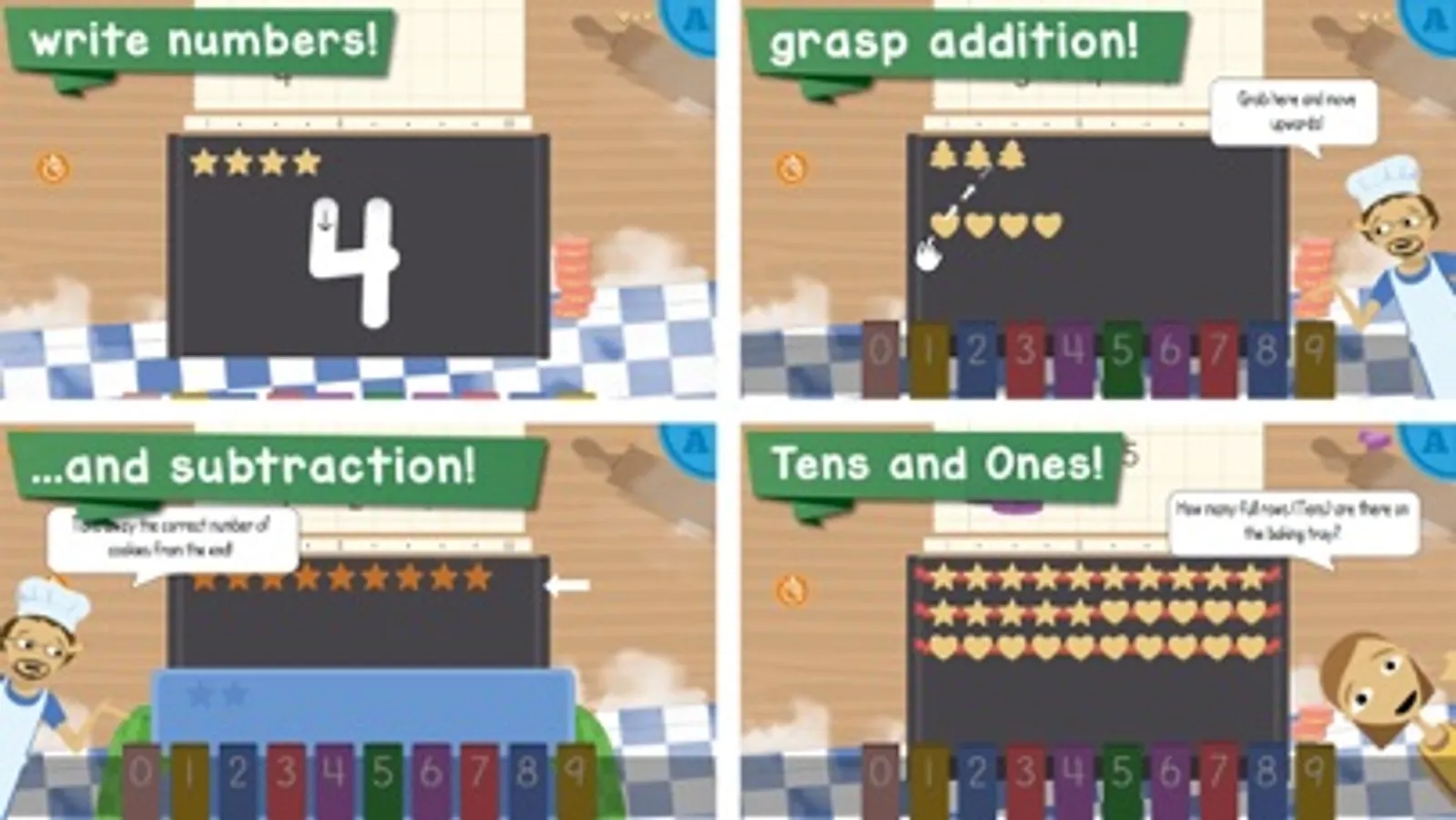 A new fun way to learn math from 4 years old. It’s just like having your own private teacher helping, encouraging and correcting. Even toddlers learn quickly to add and subtract, helping ´daddy baker’ produce gingerbread cookies. Also perfect for older children with special educational needs as the graphical style is for all ages.