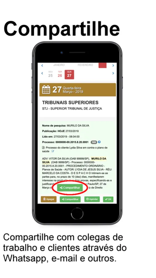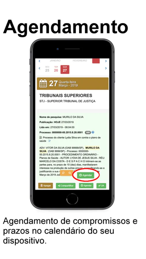 -Integração com o calendário do dispositivo móvel para agendamentos de compromissos e prazos a partir das publicações recebidas;
