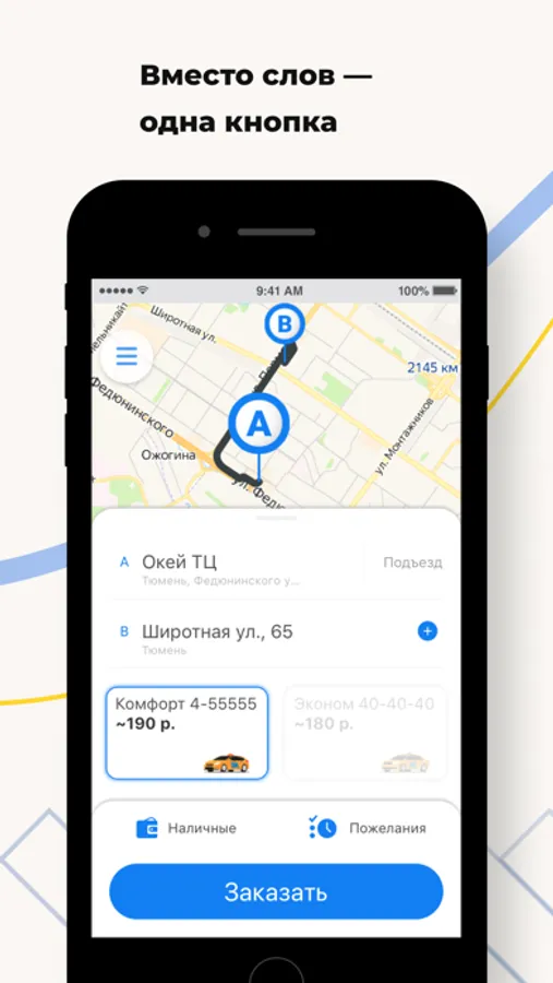 Откройте приложение, укажите адрес и закажите такси, нажав на одну кнопку.