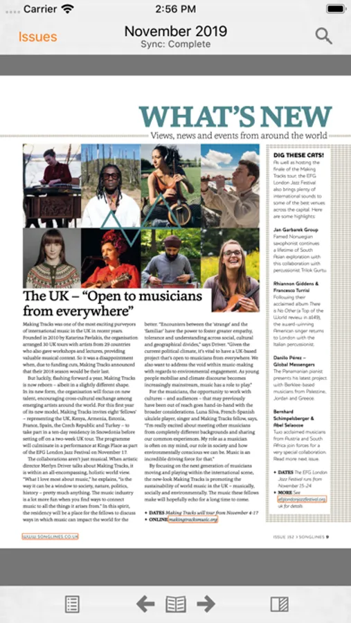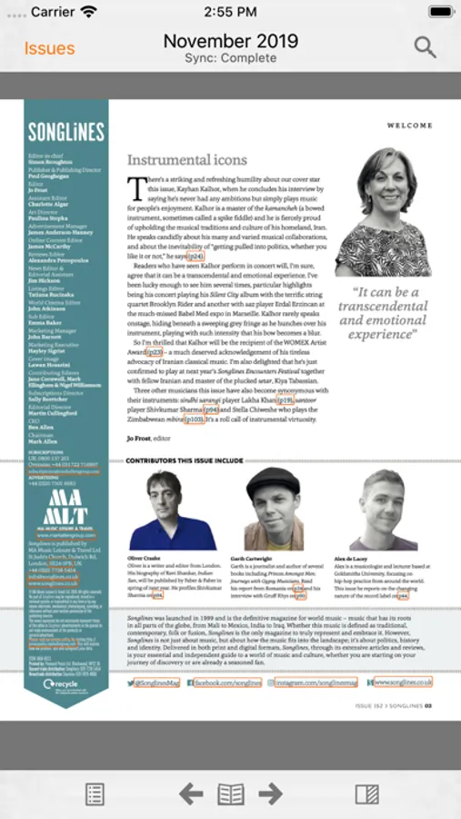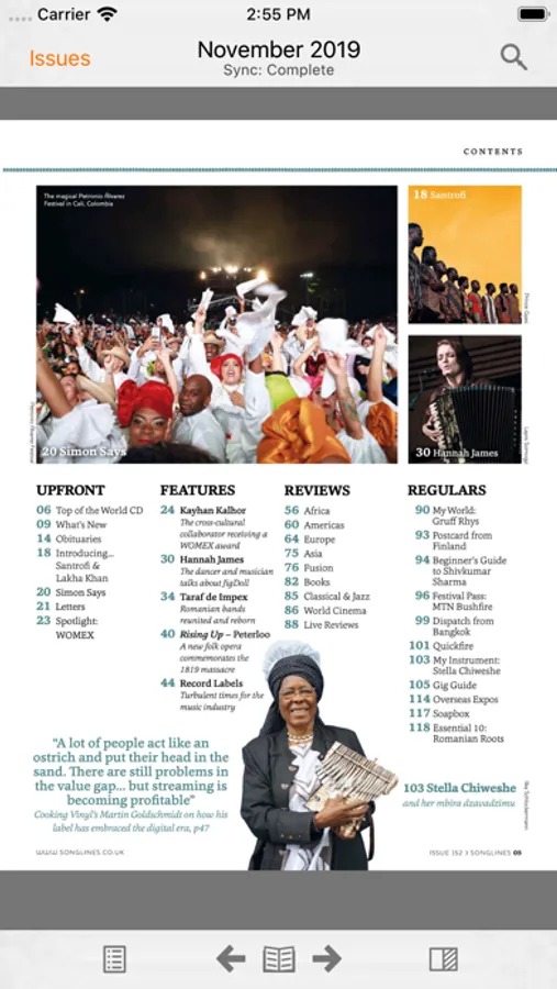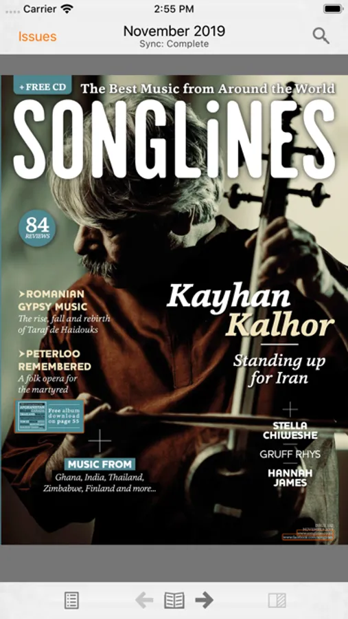 Every new issue of Songlines includes an exclusive 15-track compilation CD featuring our editor's selection of ten tracks from the best new album releases, as well as a five-track guest playlist. These have included selections by Damon Albarn, Jon Snow, Philip Pullman, Andy Kershaw, Kate Bush, Robert Plant, Cerys Matthews and Pelé. Excerpts from each of these tracks can be streamed through the Songlines iPad/iPhone edition from the Jan/Feb 2013 issue (#89). Simply click the red play button on the album covers or review pages which will automatically open your web browser and stream the track (this is the same for video links). To return back to the edition, click your device's home button (the centre bottom button) twice in quick succession and the Songlines app icon will appear at the bottom of the screen. Select that, and the magazine will reload where you left it.