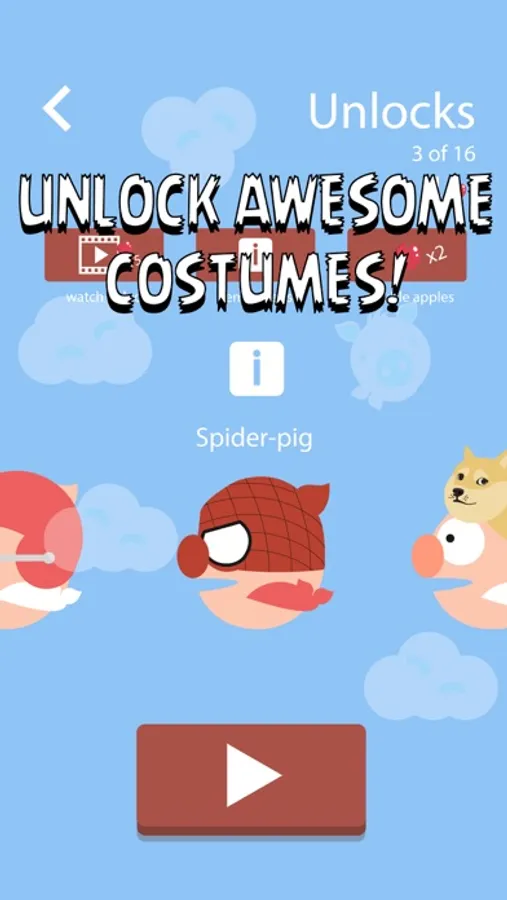 Collect the apples or earn more by watching videos to unlock awesome hats that are pretty darn cute. (The hats look great on our piggy heroes)