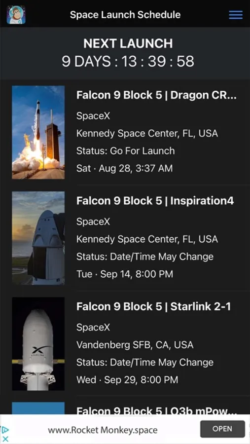 Get a list of space rocket launches from launch sites around the world. Customize the Space Launch Schedule app to display only the launch sites and agencies you are interested in knowing about. View videos of rocket launches from around the world. Get detailed information about the launch sites, rockets, missions and space launch companies including SpaceX, ULA, Rocket Lab and NASA.
