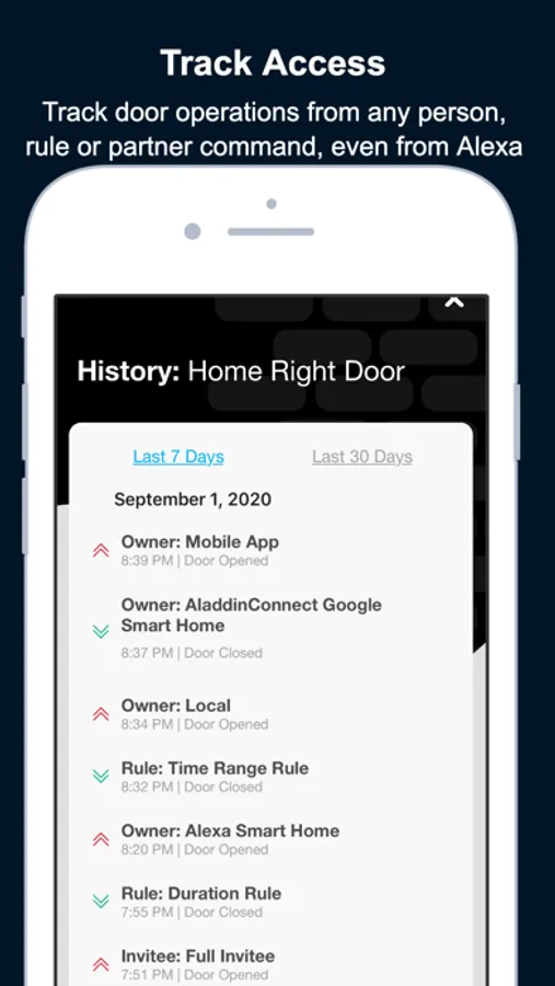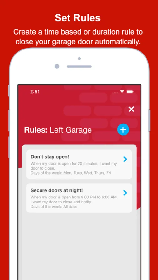 • Set up rules to automatically notify you or close the garage if the garage door is open at night or open for a long time.