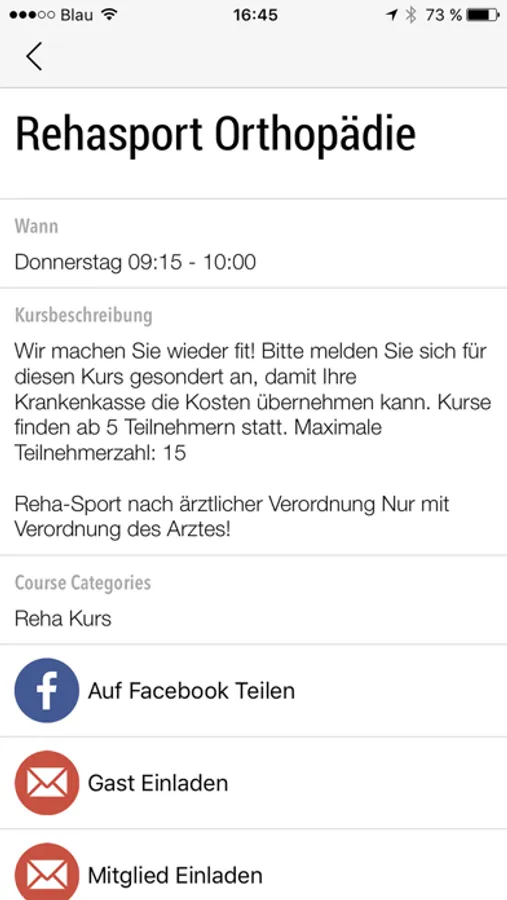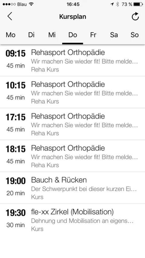 Direkter und aktueller Zugriff auf den Gruppentrainingsplan: Für jeden Kurs können Sie Details wie Zeit, Kursbeschreibung und leitender Trainer einsehen.