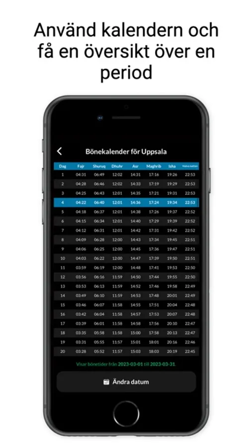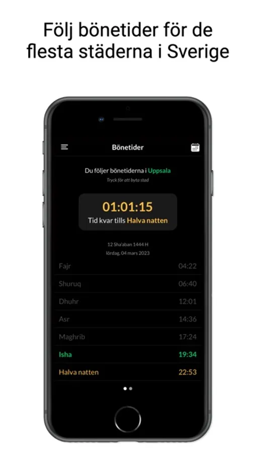 - Korrekta bönetider för 80+ svenska städer, larm vid azan kan väljas.