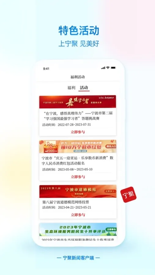 在宁聚,精创内容、优质服务、特色活动、缤纷福利一屏掌握!在宁波,媒体帮忙找宁聚,优质视频看宁聚,福利互动上宁聚!每天打开宁聚,悦享美好生活!