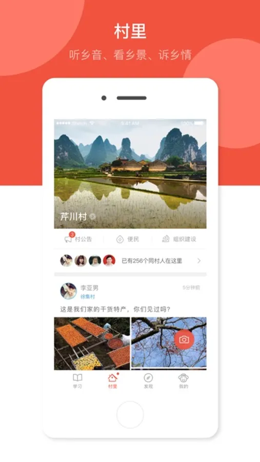 囊括全村村民,形成村级社区,提供村民之间即时通讯、话题讨论和互相帮助渠道。
