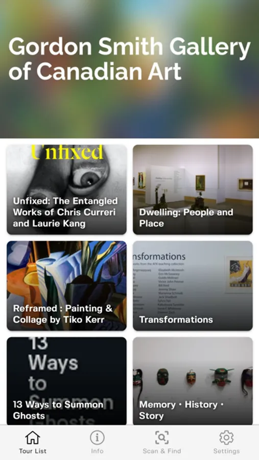 Welcome to The Gordon Smith Gallery of Canadian Art's interactive app. Learn more about our organization, where we are and interact more directly with our current exhibitions and gallery through audio clips, visuals and more! The Gordon Smith Gallery of Canadian Art is proudly supported by the Gordon and Marion Smith Foundation For Young Artists.