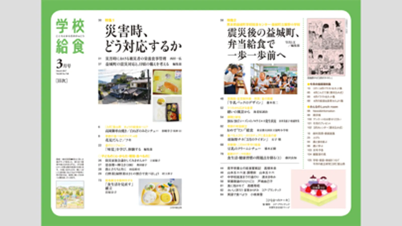 日本の学校給食の発展とともに、さまざまな問題に直面しながら、衛生管理、食物アレルギー、生活習慣病、子どもの心と健康など、テーマに合わせて特集を企画。また、給食現場に役立つ知識や全国各地の給食レシピ、食の指導に役立つ資料の無料ダウンロードなどの連載も好評です。