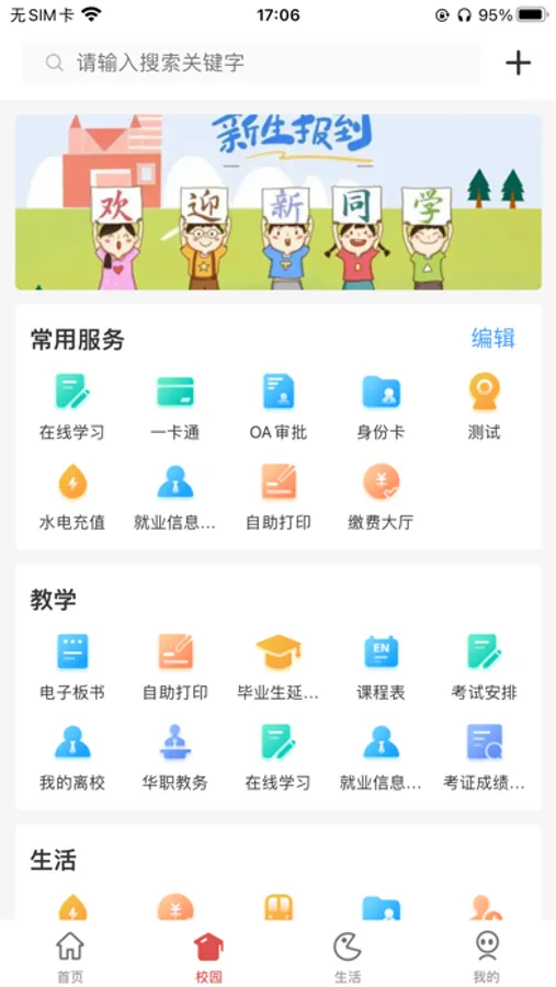 学生在校:在线学习、课程查询、考试安排、成绩查询、校园办事、图书查询、课程笔记、在校报修、校医服务、就业机会等各类服务