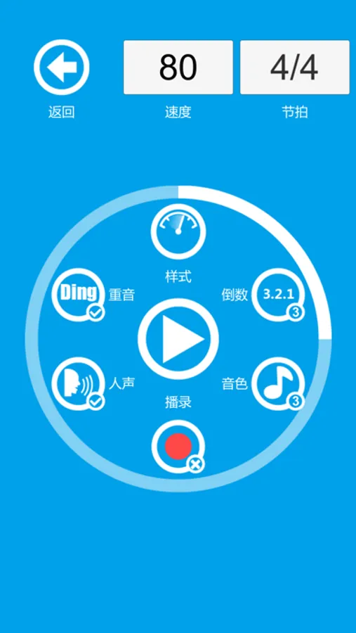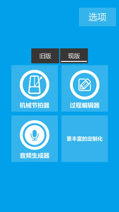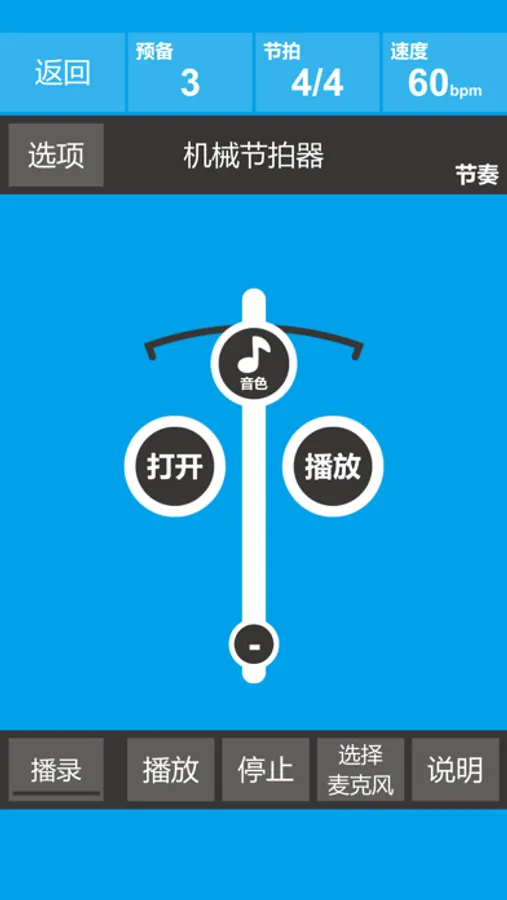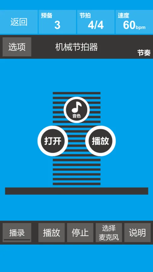 相当简洁明快的音乐节拍器,有多种界面颜色选择,有多种节拍音效选择,支持修改节拍速度(相当于摆锤),和修改振铃节拍数(相当于振铃调节拉杆)。操作界面简洁明了。
