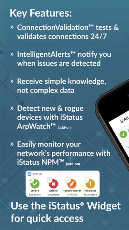 • iStatus IntelligentAlerts™ - keep you up-to-date with the current status of your network connectivity, delivered right to your smartphone, device, or via a bundled email.