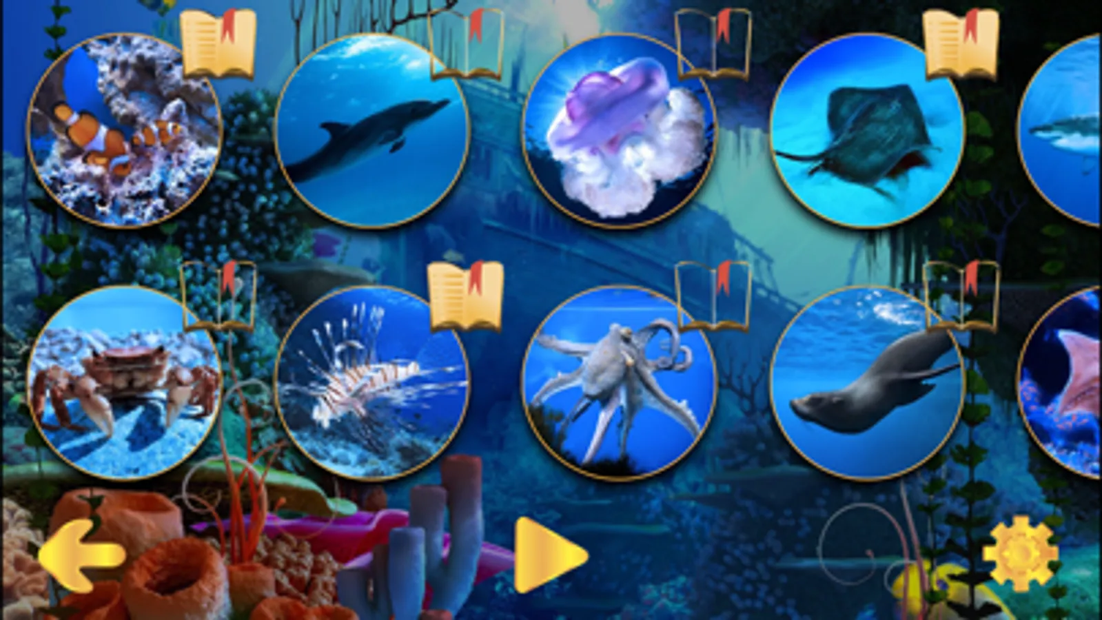 Sea Animals: a clown fish, a crab, a dolphin, a lionfish, an jellyfish, an octopus, a scatfish, a seals, a sharks, a starfish, a turtle, a whale.