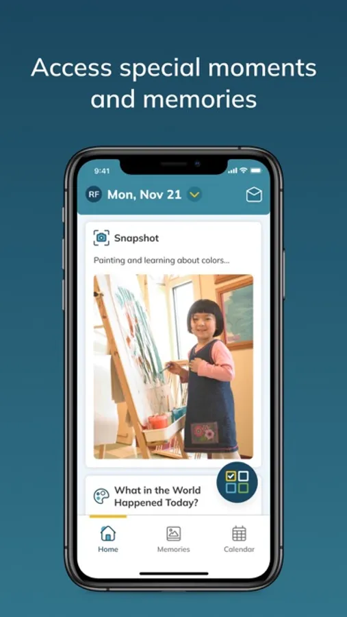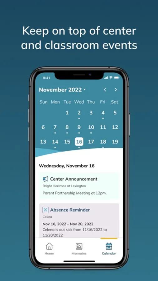 Get photos and videos of your child’s day in class and access them at any time in the Memories section—you can also save your favorites to your phone or tablet.