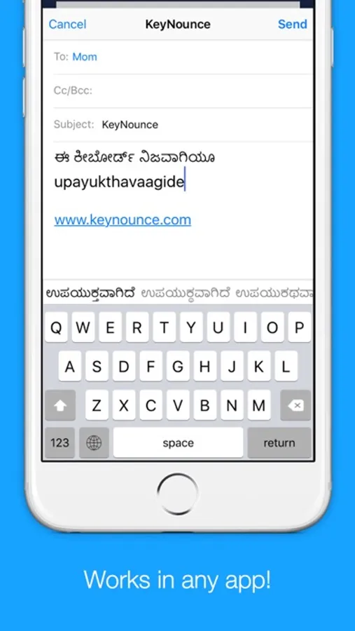 KeyNounce works in any app! Once you enable the keyboard you’ll be able to easily compose texts, emails, tweets, facebook posts, and search the web in Kannada.