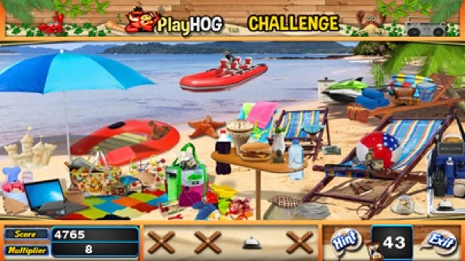PlayHOG presents Seaside, one of our newer hidden objects games where you are tasked to find 5 hidden objects in 60 secs. Your score is tied with a multiplier that increases as you find the right hidden objects, but beware, make a mistake and it will reset to 1. Try to get the highest score as you try to find all 400 hidden objects in Seaside.