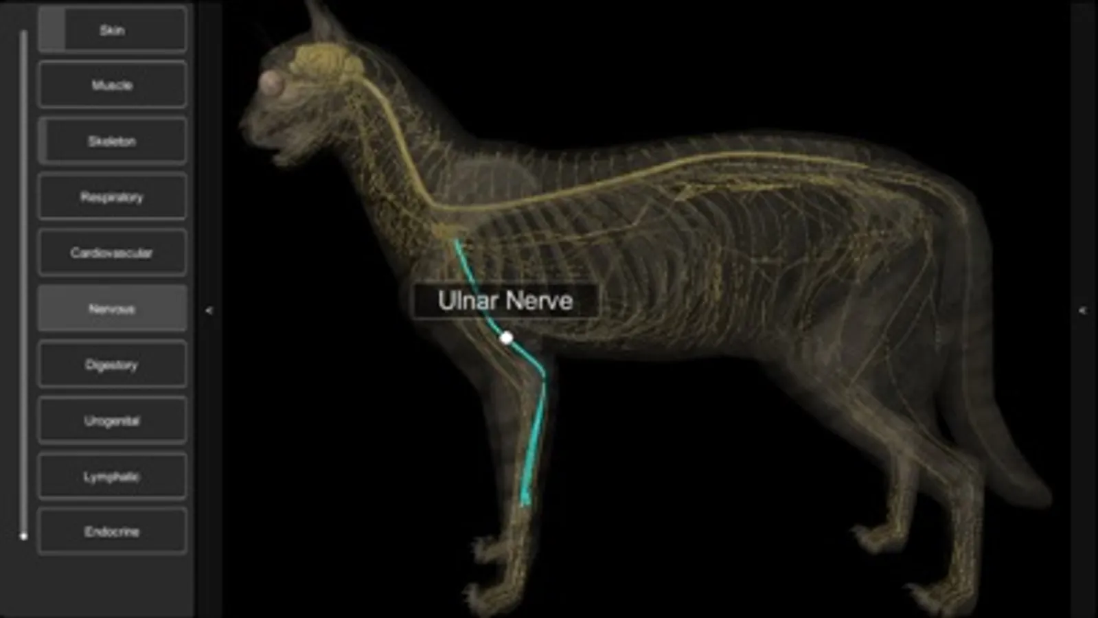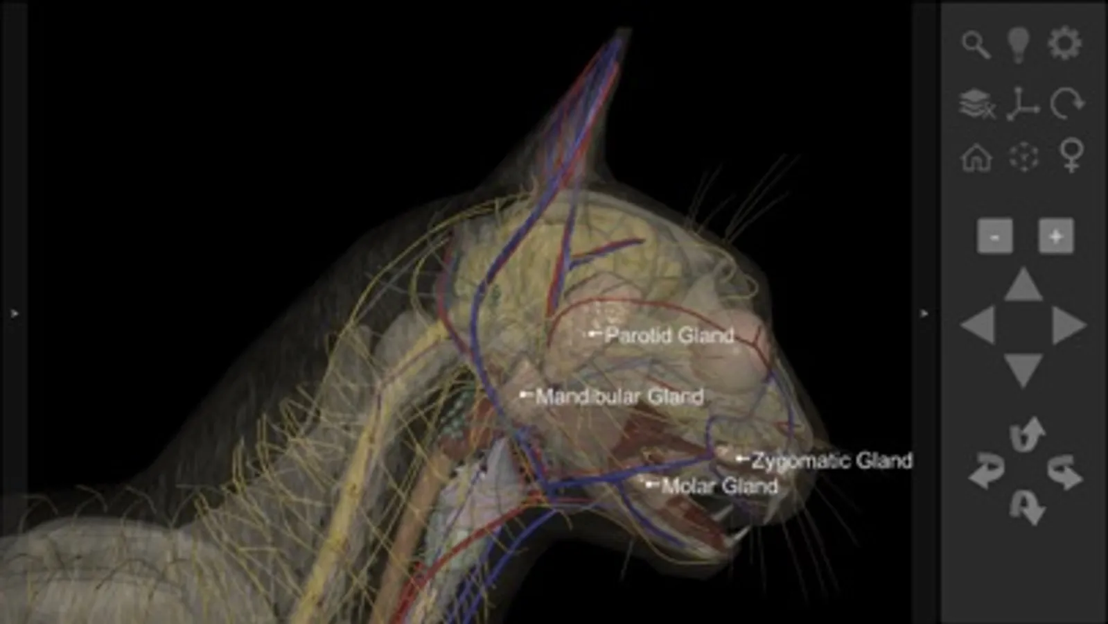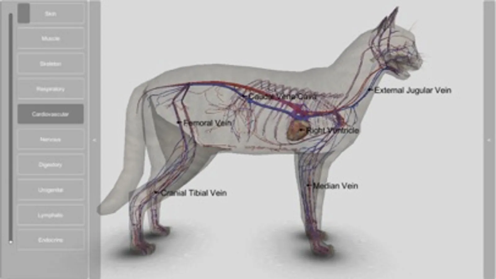 The 3D Cat Anatomy app is an interactive model that allows for the animal internal systems to be viewed and manipulated layer by layer or simultaneously with other layers, at various zoom levels. Individual anatomical structures can be highlighted and display a caption, or they can be removed to permit viewing of deeper structures.