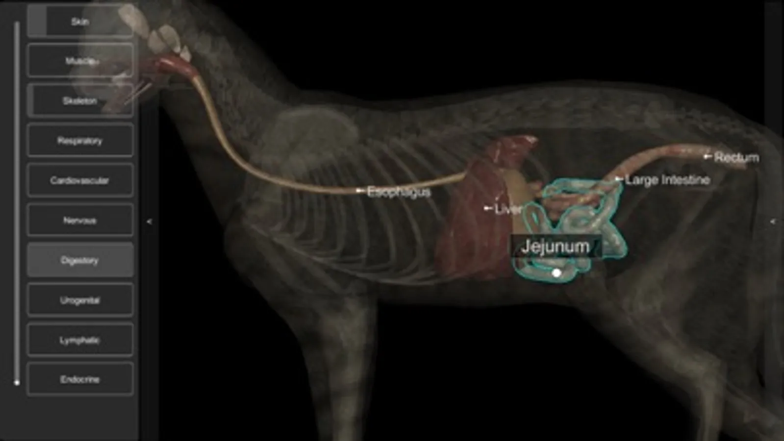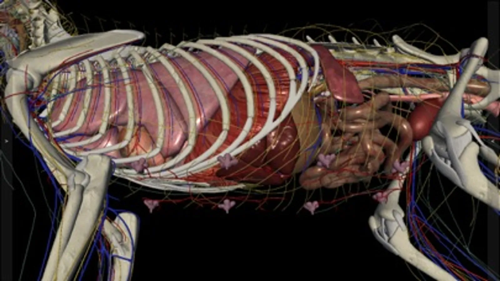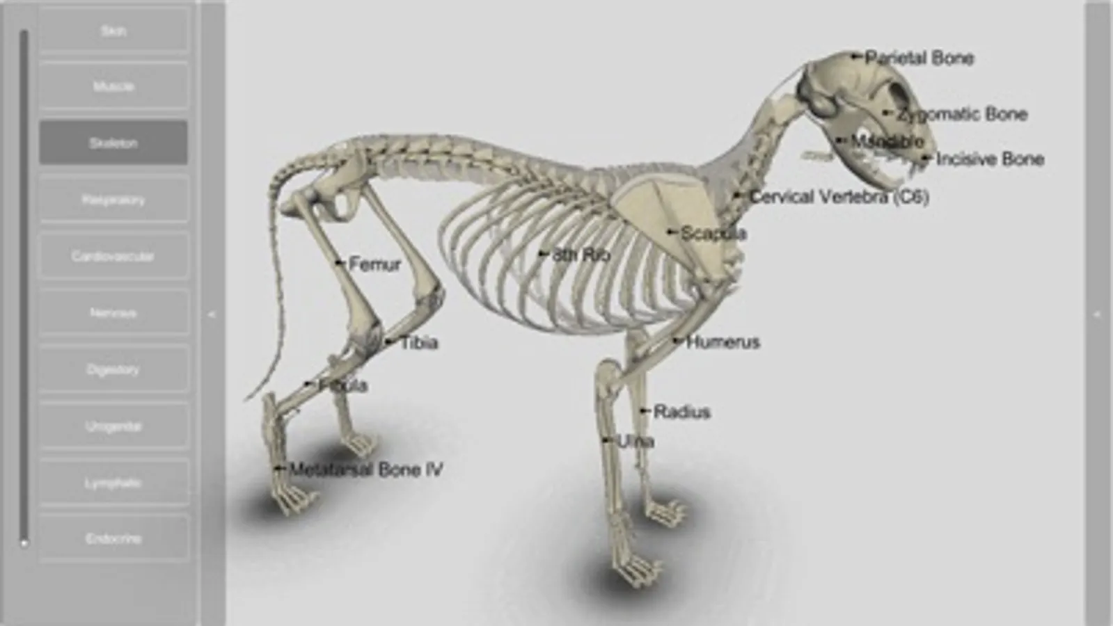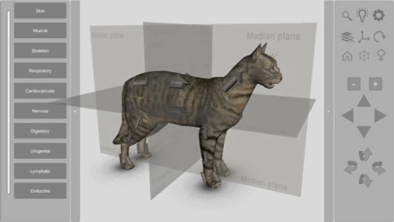 The 3D Cat Anatomy app is an interactive model that allows for the animal internal systems to be viewed and manipulated layer by layer or simultaneously with other layers, at various zoom levels. Individual anatomical structures can be highlighted and display a caption, or they can be removed to permit viewing of deeper structures.