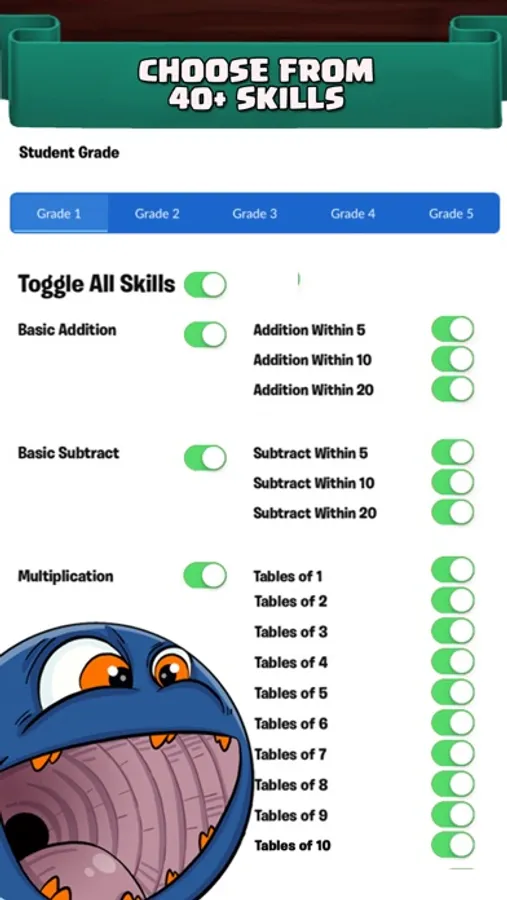 Monster Math helps your child practice and learn over 40 skills within addition, subtraction, multiplication, division, times tables as well as factors, multiples and prime numbers. It is suited for Grades 1 – 5, with standard skill presets aligned with Common Core standards. These are also fully customisable to suit your kids’ aptitude and you can move to advanced or basic skills with a simple toggle.