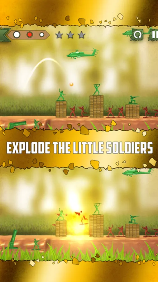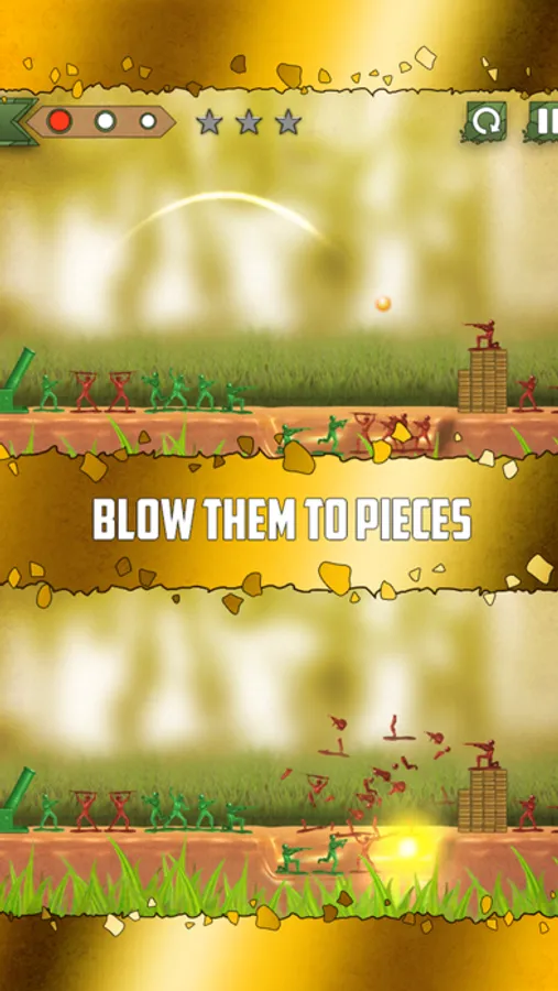 Aim your cannon, choose its caliber and shoot to blow little toy soldiers into pieces in this simple but tough game! Train your aim and timing to get 3 stars in all the levels and make the general proud!