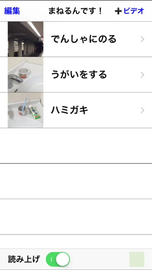 ・最初の画面で"読み上げ"のスイッチをオンにすると、ビデオ再生画面でタイトルを合成音声で読み上げてくれます。