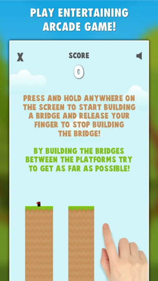 * Put your finger anywhere on the screen to start building the bridge and release your finger to stop building the bridge! Get from one platform to another and try to survive as long as possible! Watch out for increasing difficulty!