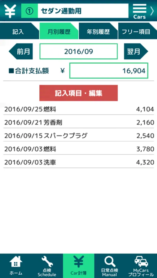 燃料代や洗車代といった一般的な出費はもちろん、「点検Schedule」に収録された項目とも連動しているので、定期点検や部品を交換・補充し、記録したタイミングに合わせ、その費用を記帳することができます。