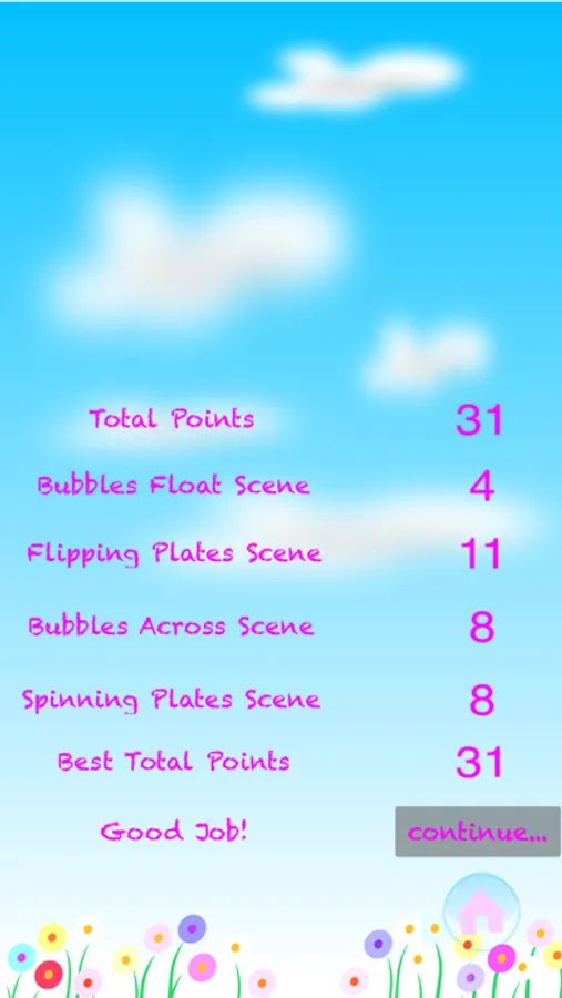 There are 4 modes, with bubbles going up, bubbles rotating to reveal the item and hide it, bubbles going across, and bubbles that spin the items around like a spinning plate. After you complete 2 rounds of 5 bubbles, the game switches to the next mode. After you complete all 4 modes then the first mode starts again, but with snow falling. After 4 modes of 2 rounds each, the game switches to night mode, which has especially pretty effects when the bubbles pop. Then we add snow to night mode, with a fog effect. All the items to match are pronounced by a preschool American girl speaker. Both the bubble and word are the matching color for color mode, and the word for the color is also on the bubble.