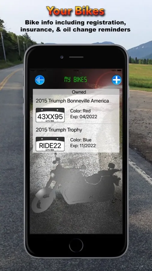 You can add buddies to each trip and assign a bike, which will show you if it's registration, oil change, and insurance is current.
