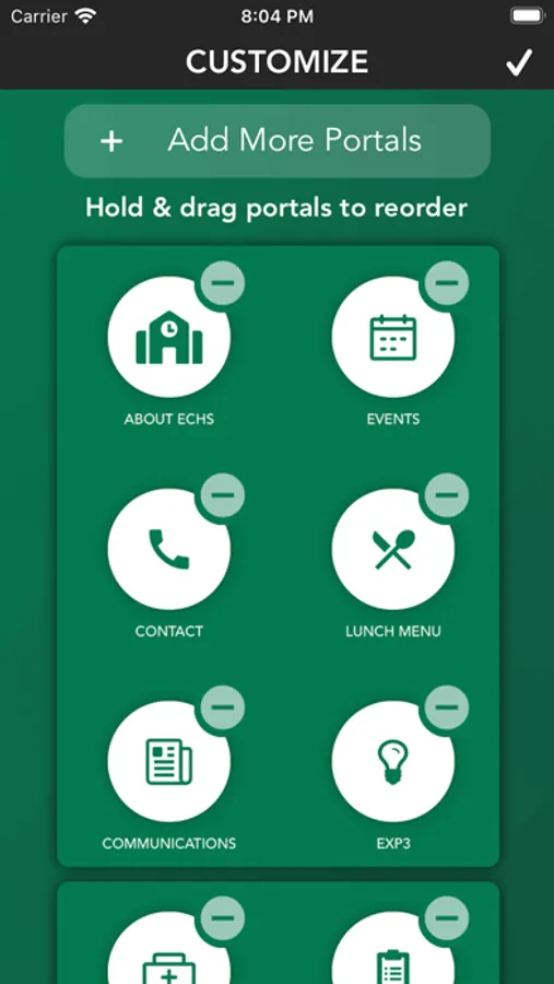 Your ECHS app is fully customizable by you: Rearrange your portals to easily access whichever features you use most. If you want to check school announcements frequently, you can put that portal front and center. If you never check the lunch menu, you can turn that portal off.