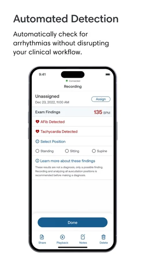 When connected to a compatible digital stethoscope, the Eko App automatically checks for arrhythmias during auscultation and rhythm assessments when recording analysis is enabled.
