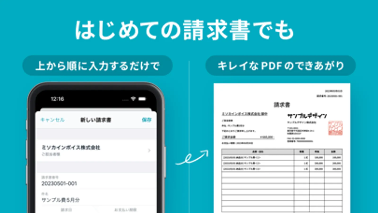 はじめて請求書を作る方も、項目に入力するだけでかんたんにキレイな請求書を作ることができる請求書作成アプリです。