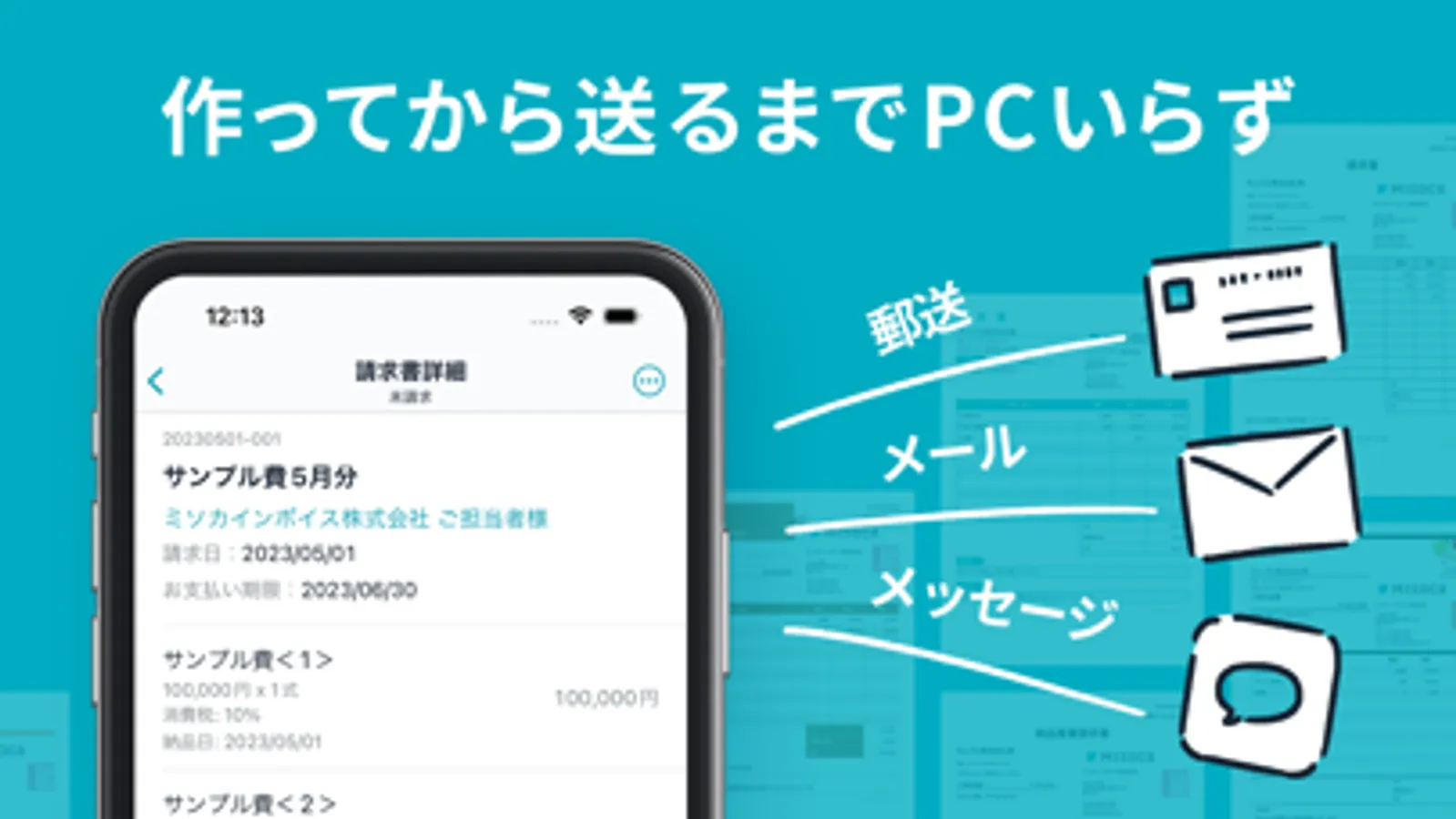 ・作成した請求書をスマホからかんたんにメール送信・郵送手配が可能