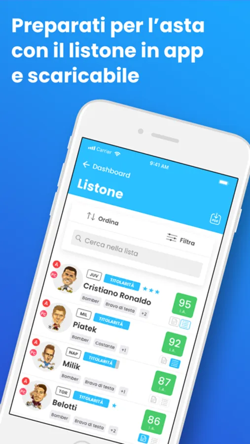 - L'Indice di Appetibilità (I.A.) di tutti i calciatori, necessario per capire con un solo sguardo chi è da acquistare e chi no;