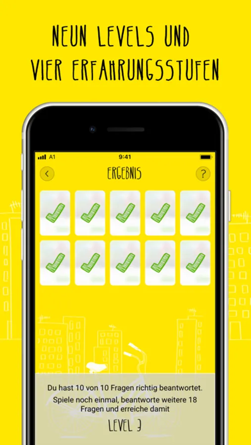 Um vom „Dreirad-Fahrer“ zum „Fahrrad-Champion“ aufzusteigen musst du insgesamt 9 Levels bezwingen und mit deinem Wissen 4 Erfahrungsstufen absolvieren: