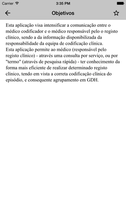 O objetivo desta aplicação é intensificar a comunicação entre o médico codificador e o médico responsável pelo registo clínico, sendo a informação disponibilizada da responsabilidade da equipa de codificação clínica.