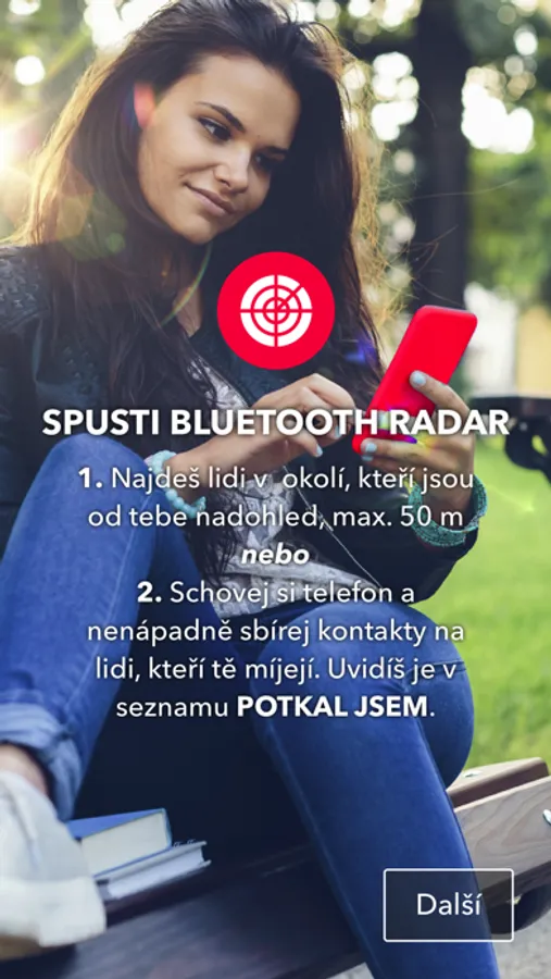 Pomocí radaru vyhledáš osoby vyskytující se v tvém okolí do 50 metrů. Můžeš také nechat aplikaci sbírat kontakty na osoby, které potkáš během dne.