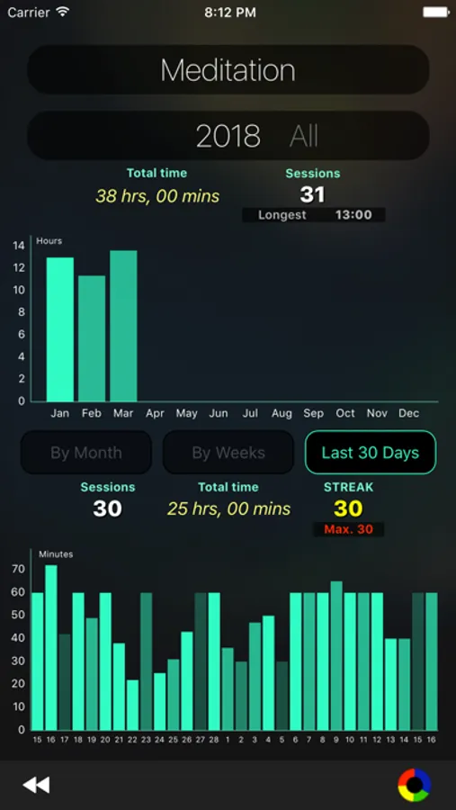 - Powerful Statistics section. See your longest session, your current continuous days of practice, your longest streak, the total practice time and total of sessions, with beautiful and clear charts easy to read. Select the period to review by year, by month, by days, by weeks , by last 30 days and last 30 months.