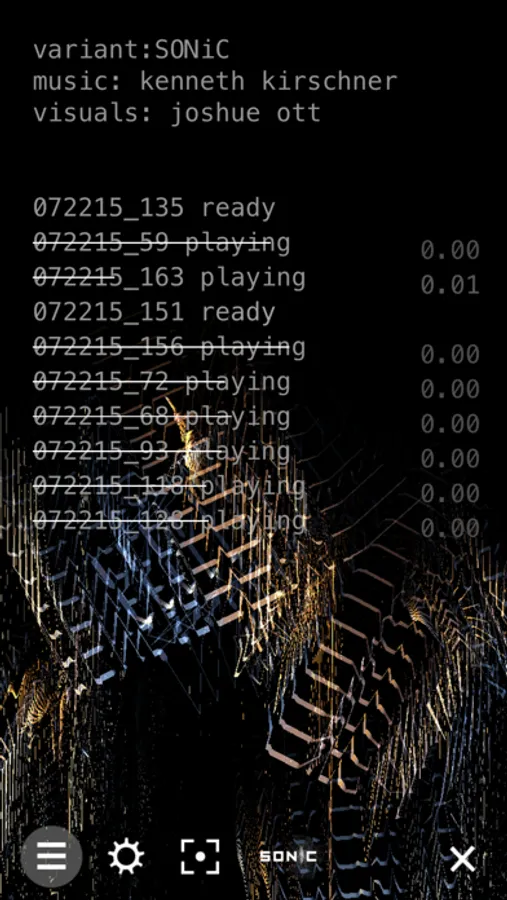 You can view the indeterminate audio engine by tapping the dot in the lower right. The display shows the different elements of the musical composition as they are loaded by the engine through a combination of chance and user input. The center button opens a menu of settings for the app, and the button to the right allows you to take screenshots of the visuals, automatically saving them to your photo library.