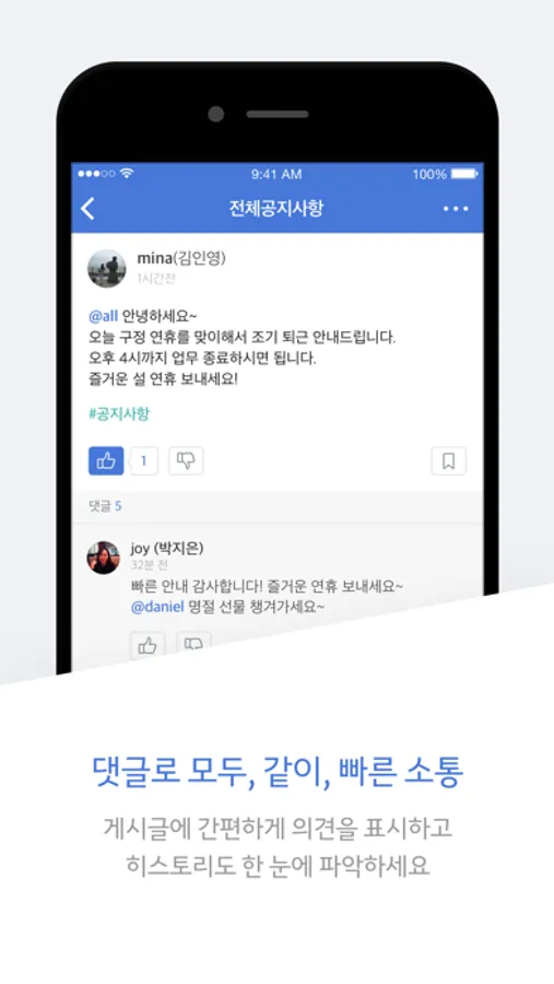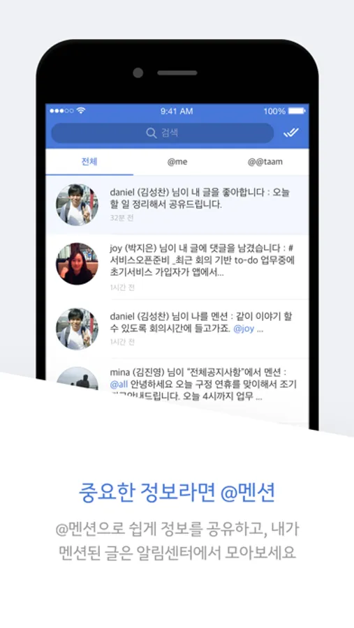 멘션 기능과 참여하고 있는 그룹별 알림 설정을 통해서 중요한 정보를 놓치지 않고 공유받을 수 있습니다.