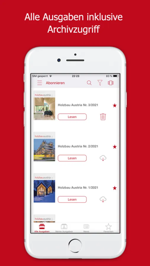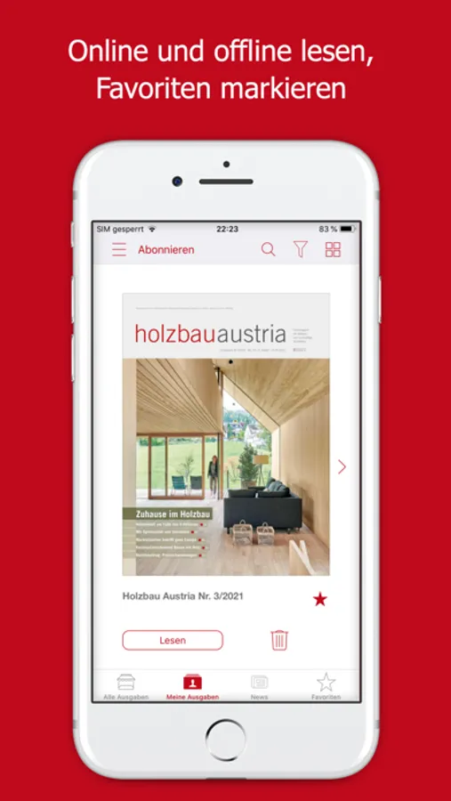 Die App holzbau austria ermöglicht den elektronischen Bezug des E-Papers, welches zwei Tage vor Erscheinen des Printmagazins veröffentlicht wird. Leser haben die Möglichkeit, Einzelausgaben für 4,49 € zu kaufen oder Jahresabonnements (35,99 €/Jahr) abzuschließen. Eine Testausgabe steht zum kostenlosen Download zur Verfügung.