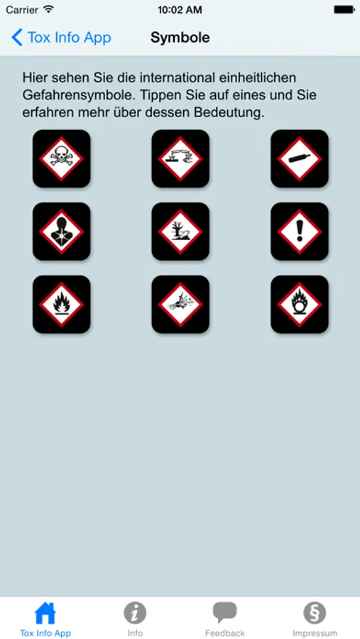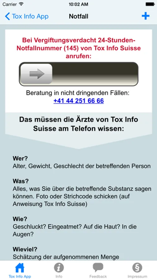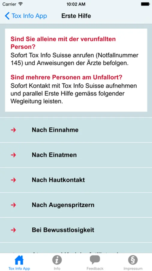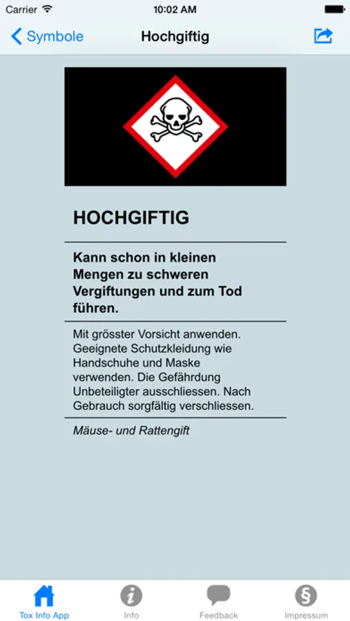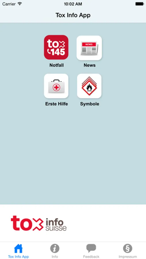 Mit der Tox Info App haben Sie zudem alle wichtigen Hinweise zur Ersten Hilfe bei Vergiftungen und Vergiftungsprävention sowie Informationen rund um die Gefahrensymbole jederzeit auf Ihrem Smartphone oder Tablet verfügbar. Als Option verschickt das Tox regelmässig Kurzmitteilungen zu aktuellen Themen rund um Gifte und Vergiftungen.