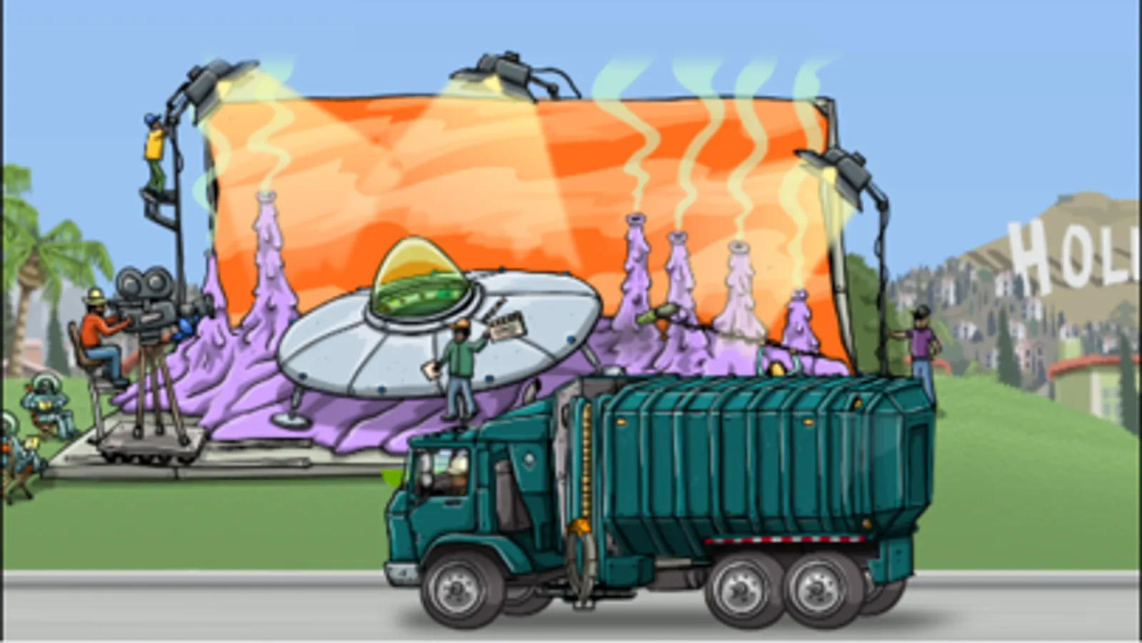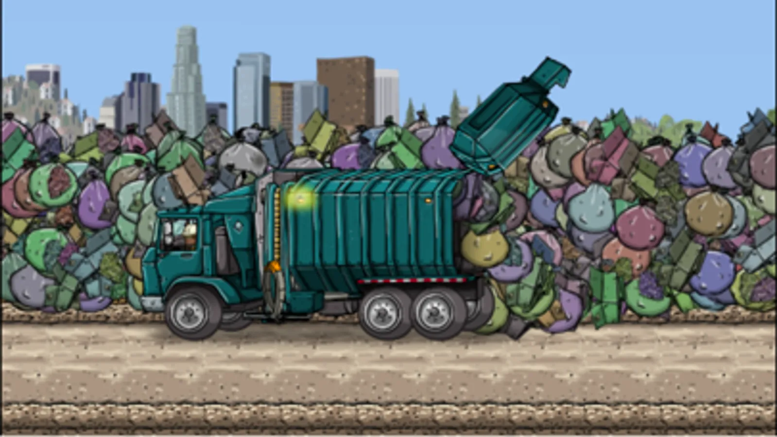 Ride along on a garbage truck on garbage day as it drives through a neighborhood in Los Angeles, California. Use the automatic side arm to pick up the garbage cans and visit fun places in Los Angeles, California. Look for dolphins in the ocean, visit a fun movie set, pick up some donuts at the donut shop and more! When your truck is full its time to go to the Waste Disposal Facility and dump the truck. Once the truck has been dumped drive the powerful Masher Dozer Truck to squish the garbage as flat as you can!